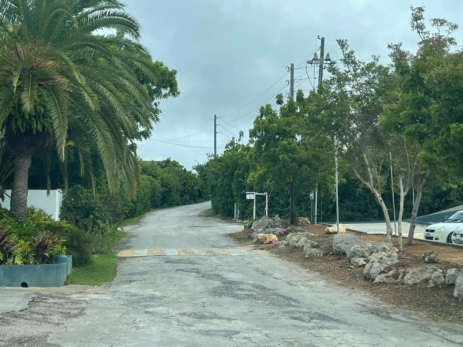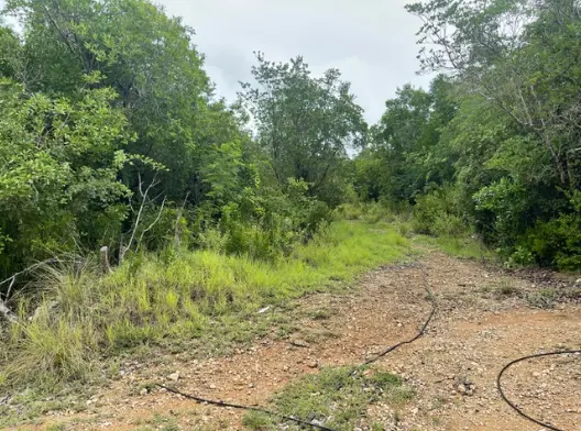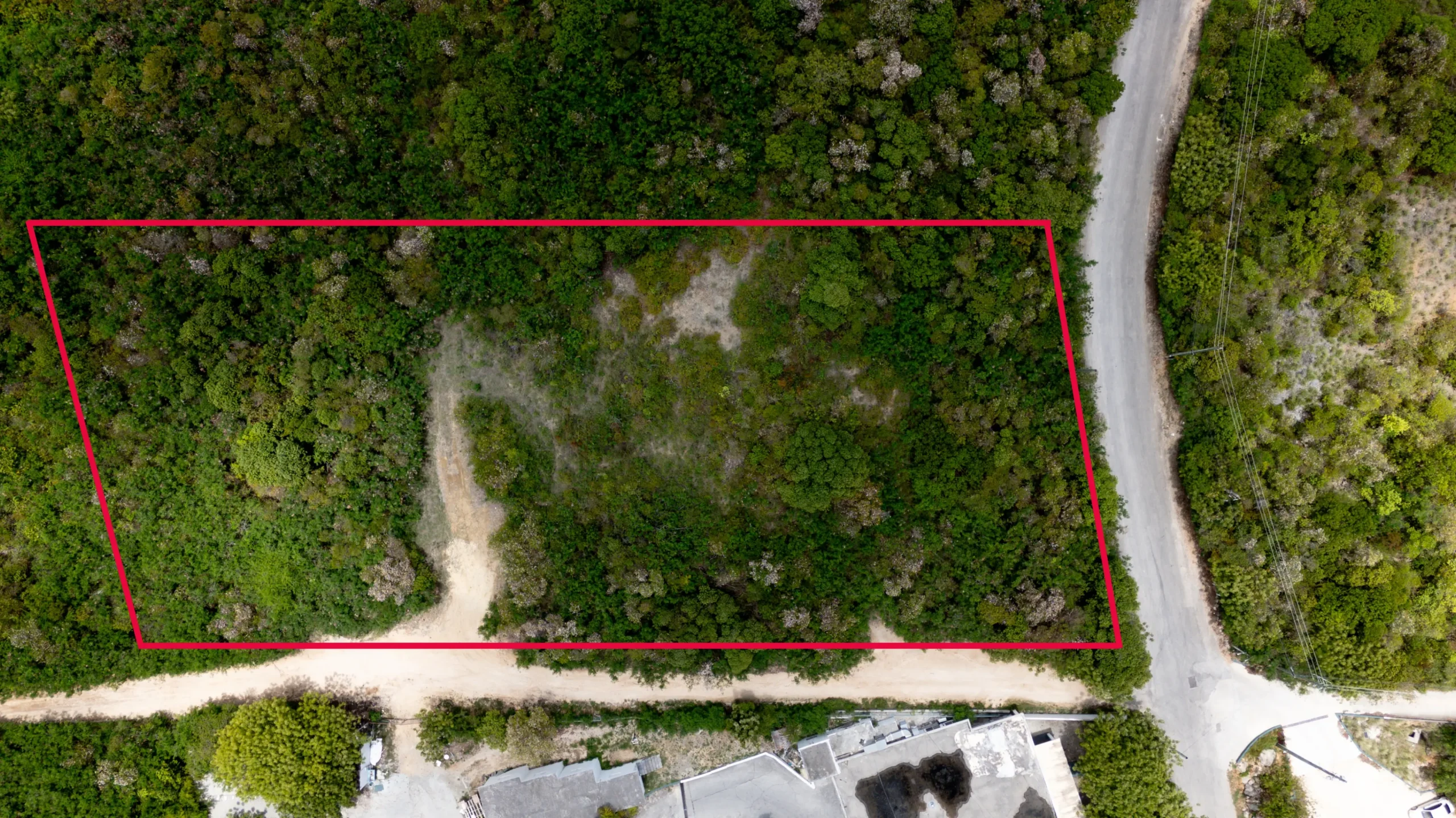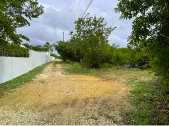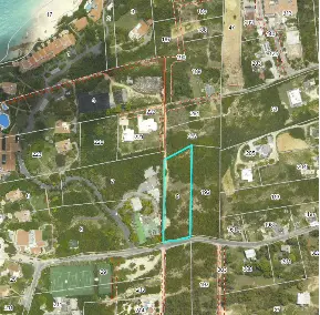 The land is trapezoidal in shape, gently sloping from north to south, measuring approximately 110 feet by 360 feet, and is covered with tree grass and shrubs. It is bounded by the main public road to the south and a right-of way to the west near the Malliouhana Hotel.